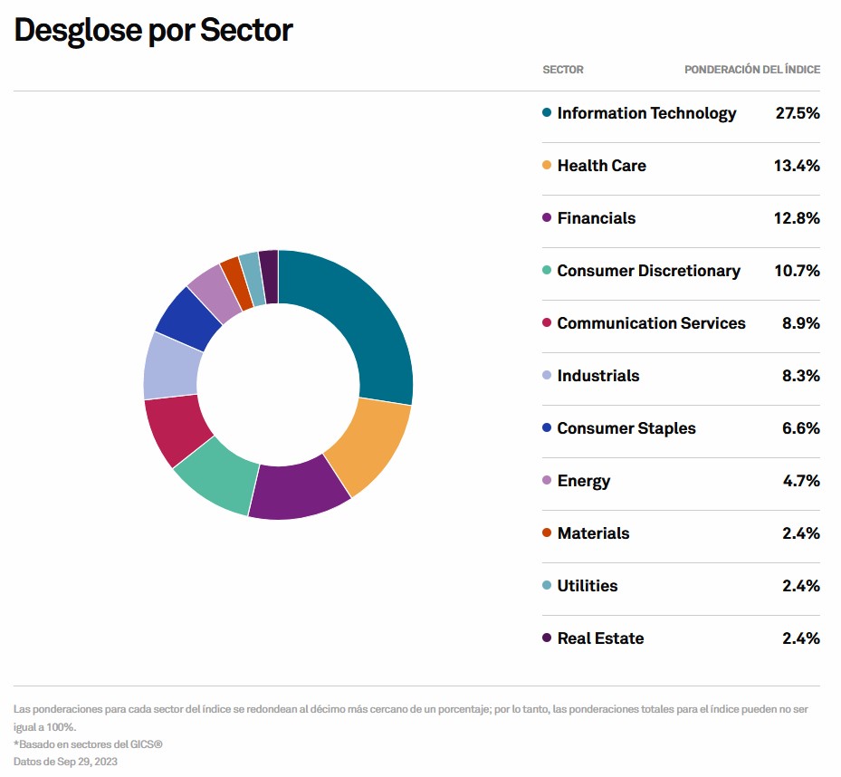 El S&P 500 es un índice bursátil ponderado por capitalización, esto significa que cada empresa tiene un peso distinto en el índice, el cual sigue el rendimiento de las 500 empresas más importantes que cotizan en la bolsa estadounidense. El índice está compuesto por empresas de una amplia gama de sectores económicos (finanzas, energía, salud, tecnología…) y, en conjunto, abarca aproximadamente el 80% de la capitalización bursátil total del mercado de valores estadounidense.
