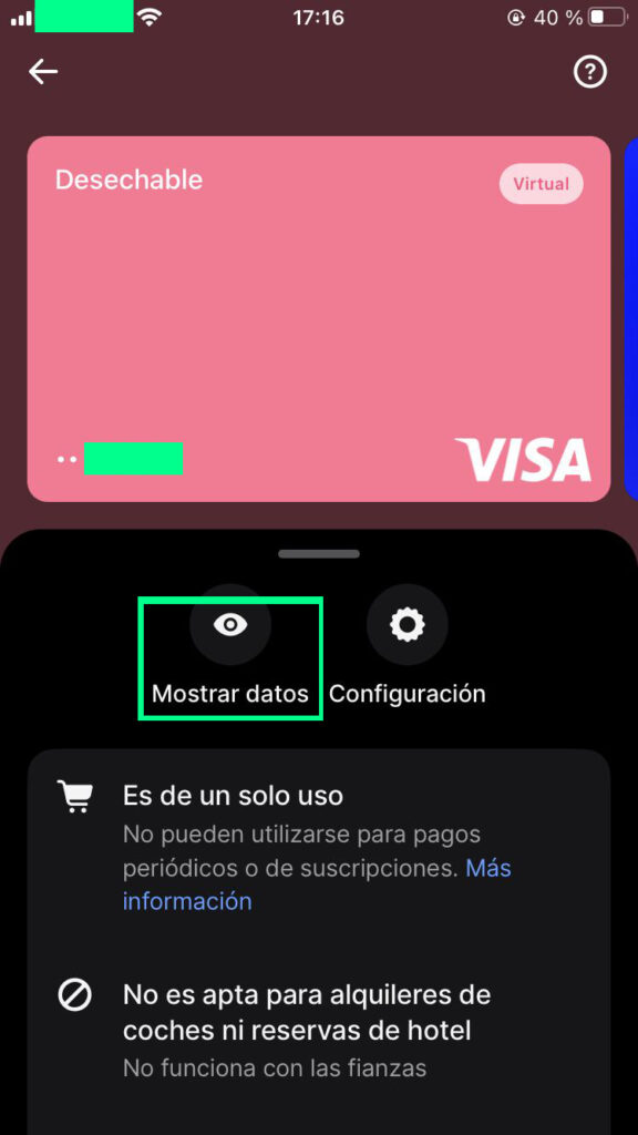 Aquí, simplemente tendrás que pinchar en Mostrar datos y te aparecerán todos los datos de tu tarjeta: Número de tarjeta, fecha de caducidad y CVV. Simplemente tendrás que utilizar estos datos para realizar el pago online en cualquier plataforma (como por ejemplo Amazon, eBay, Just Eat o Temu) y se realizará el pago con los fondos de tu cuenta.